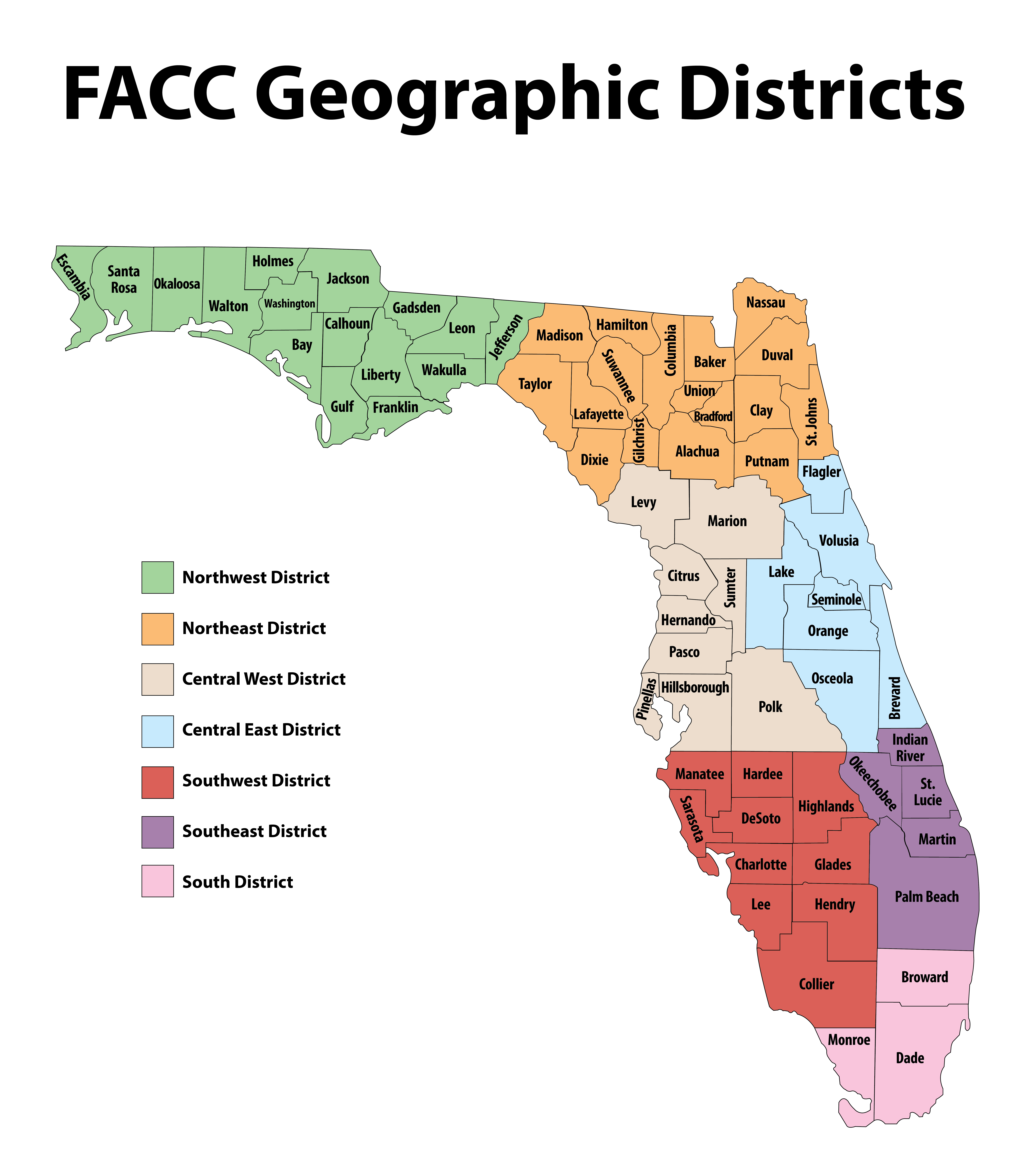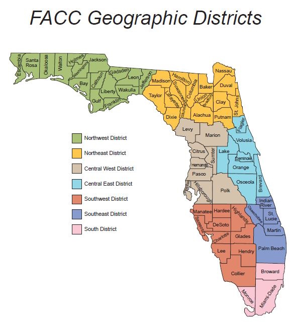 FACC is organized into seven districts that cover all counties across Florida. Each district is overseen by a director who acts as a vital link between the FACC Executive Board and the clerks within their designated region. Click the image to the left for a full-size map.